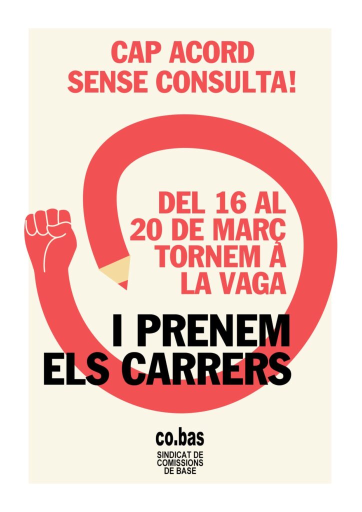 Davant de l’acord que el passat dilluns 9 de març els sindicats CCOO i UGT i el Departament d’Educació van signar rebaixant enormement les demandes del col·lectiu, a esquenes de les treballadores docents i sense consultar a les assemblees on els i les docents estem democràticament organitzades, des de co.bas Educació fem una crida a la participació massiva a les assemblees de centre i de zona, a les mobilitzacions i a secundar les vagues convocades del 16 al 20 de març. L’acord menysté les treballadores educatives i es concreta en una pujada salarial inferior al 2%, una baixada de ràtios insuficient que, a més, no entraria en vigor fins el curs 2027 – 2028, 50 euros/nit per pernoctacions en colònies i viatges escolars o l’anunci d’un pla integral de simplificació administrativa que no ha estat concret. Una vergonya i un escàndol que el col·lectiu docent no podem permetre. Ens hi juguem la nostra dignitat.